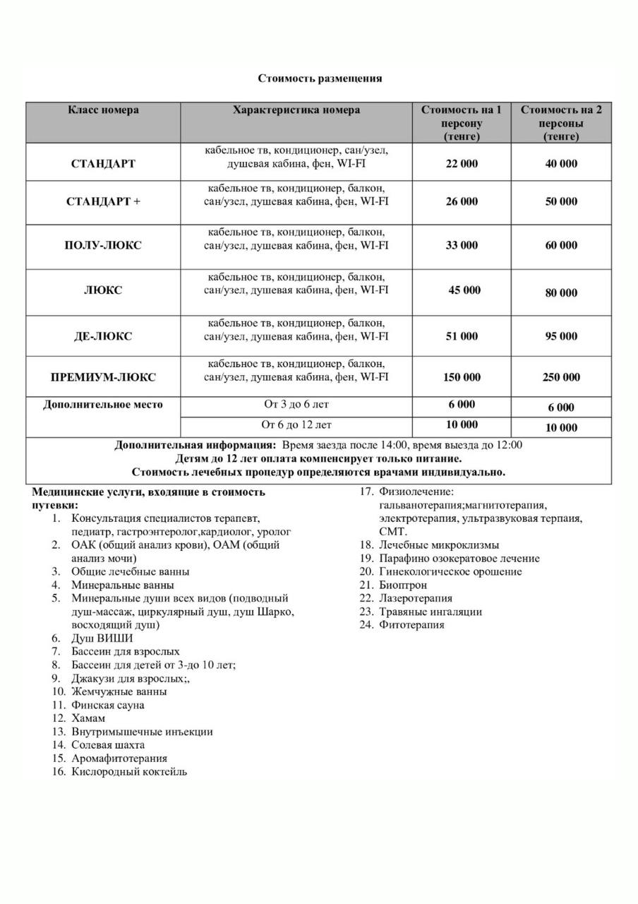 На этом курорте для отдыхающих предусмотрены все удобства. Здесь имеется множество специальных кабинетов для медицинских процедур. В здании есть бассейн, который подогревается зимой и летом.